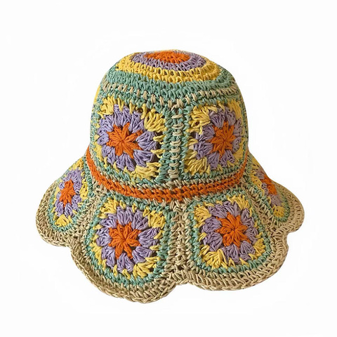 Nueva moda de ala ancha de ganchillo cubo sombrero de paja verano flores Color tejido a mano sombrilla para Unisex