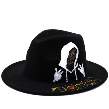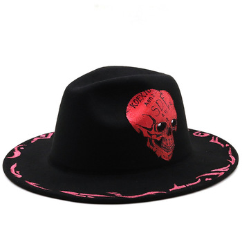 หมวกฮาโลวีนปีกใหญ่หมวกเฟโดร่าสำหรับฤดูใบไม้ร่วงฤดูหนาวพิมพ์ลายหัวกะโหลกออกแบบโลโก้ได้ตามต้องการหมวกแจ๊ส